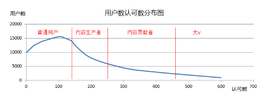 以问答社区为例,主要KPI是内容数量和质量,体现在用户所贡献内容获取的认可数上,通过数据收集整理得出用户认可数分布如下,我们以用户认可数为指标建立用户分层。
