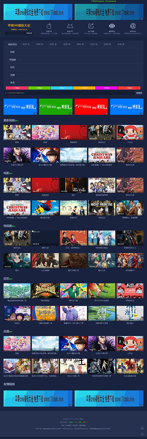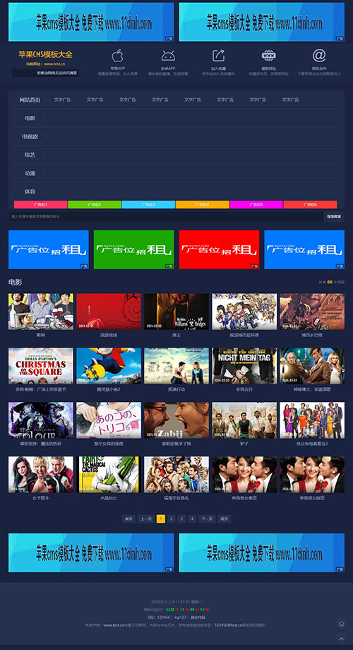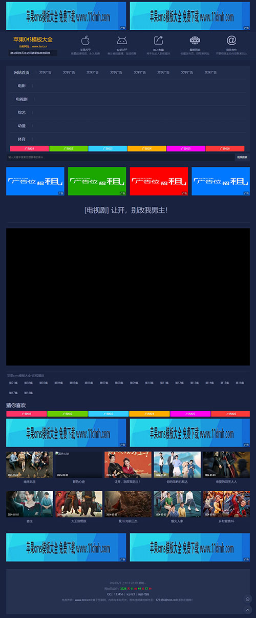 大气蓝色背景、白字设计,页面结构简单,只有首页、列表、播放,无详情页,适合于做电影站、X站,代码手机显示优化,当然pc也可以访问。