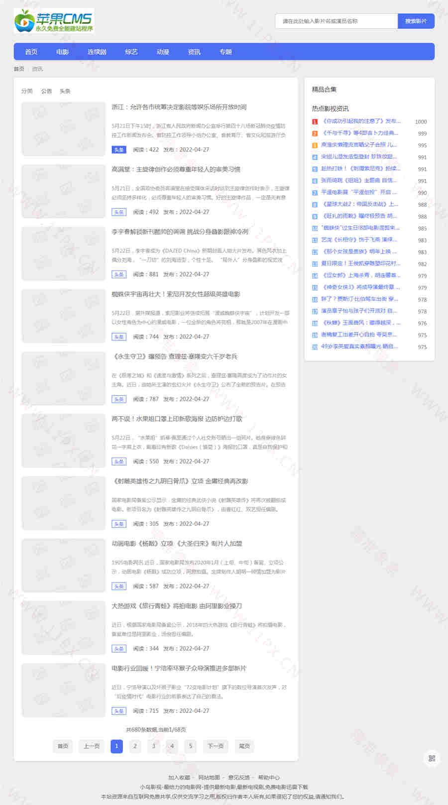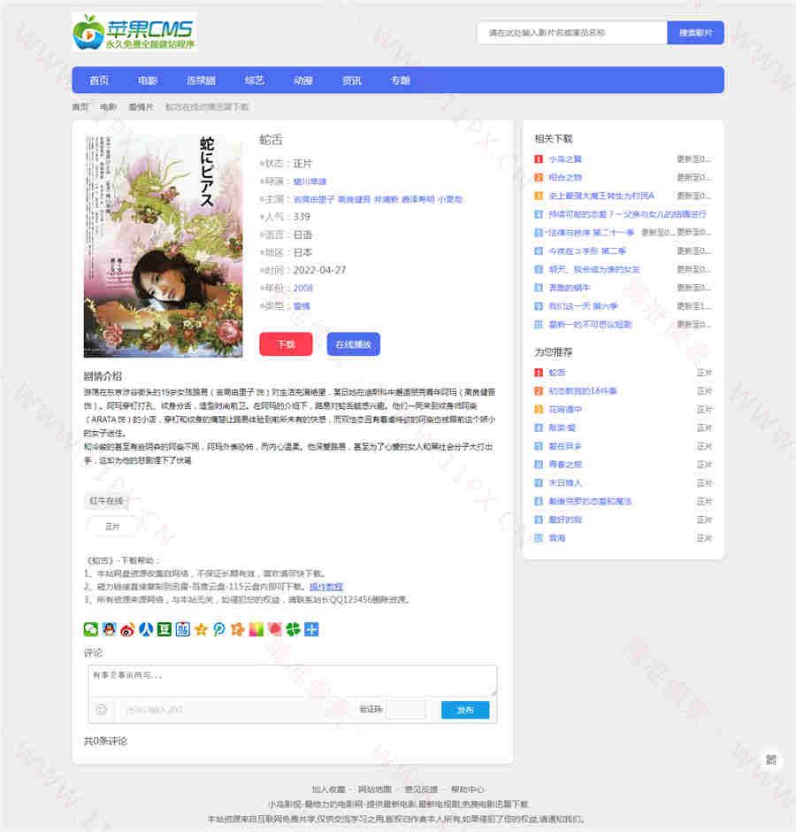风格小巧简单干净,响应速度快。模板包含首页、影视模块、新闻模块、专题、搜索。