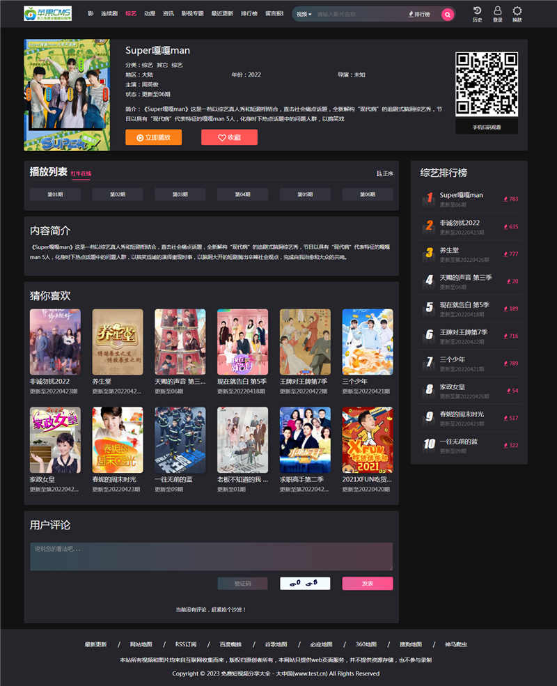 一款全能模板,所有页面都有,模板包含首页、影视、文章资讯、专题、留言板、排行榜、黑白风格切换。