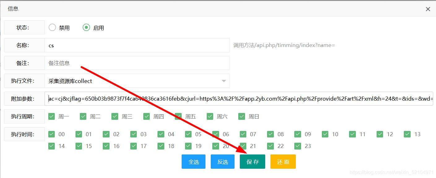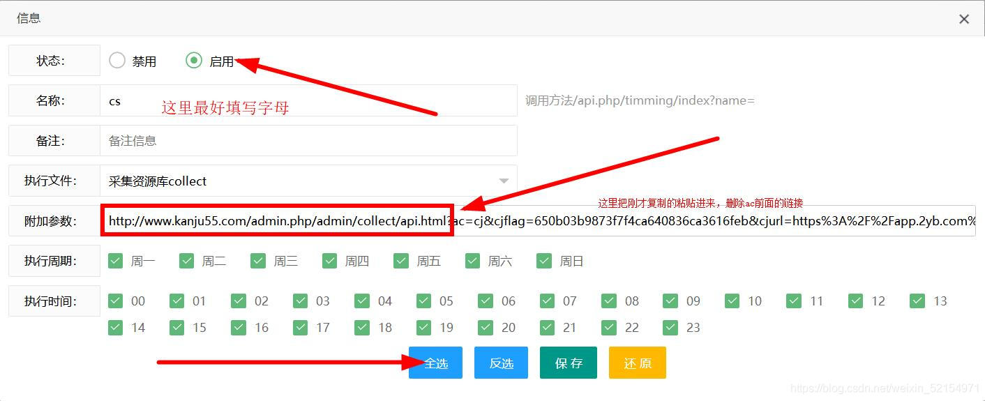 直接复制进去的地址:http://www.kanju55.com/admin.php/admin/collect/api.html?ac=cj&cjflag=650b03b9873f7f4ca640836ca3616feb&cjurl=https%3A%2F%2Fapp.2yb.com%2Fapi.php%2Fprovide%2Fart%2Fxml&h=24&t=&ids=&wd=&type=2&mid=2&opt=0&filter=0&filter_from=¶m=这时候我们把ac=cj前面的删除掉,删除完后就是这样的:ac=cj&cjflag=650b03b9873f7f4ca640836ca3616feb&cjurl=https%3A%2F%2Fapp.2yb.com%2Fapi.php%2Fprovide%2Fart%2Fxml&h=24&t=&ids=&wd=&type=2&mid=2&opt=0&filter=0&filter_from=¶m=这样就得到正确的我们点击保存
