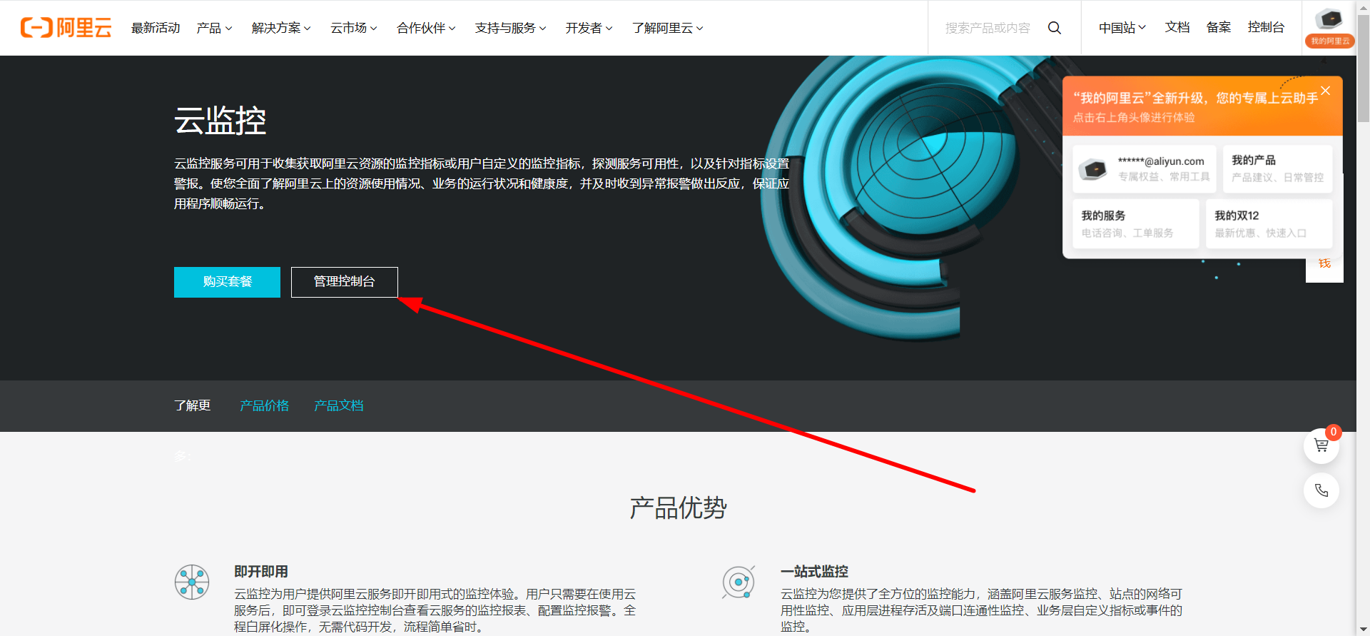 第二种:阿里云云监控先打开阿里云云监控控制面板:https://www.aliyun.com/product/jiankong/