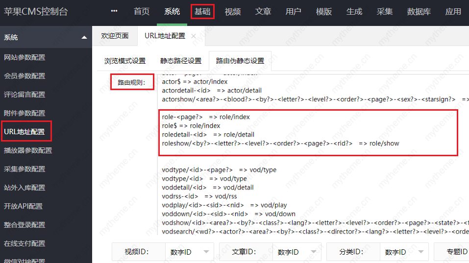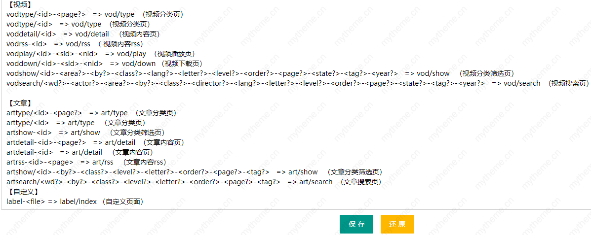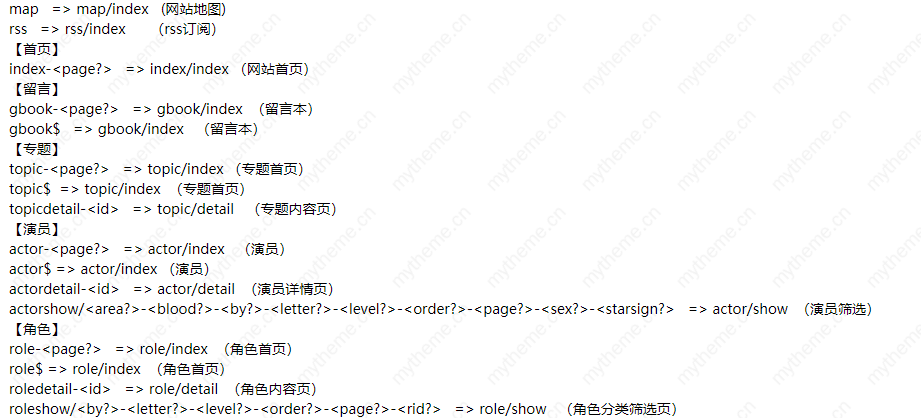 二,自定义路由规则首先要清楚认识路由规则定义的名称,下图详细的注明了我们要自定义规则的名称。如果你想改视频,专题,文章等或其他页面的规则请按对应名称修改即可。