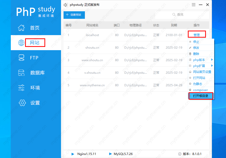 1,打开我们已经安装好的phpstudy软件在安装后都有个默认的站点,我们今天就使用这个默认的站点来安装苹果cms,不再单独去创建网站,当然如果想创建的话可以参考昨天我们分享过的phpstudy快速搭建网站教程来创建一个新的站点。创建好后和下面的截图的操作步骤一样【网站--管理--打开根目录】