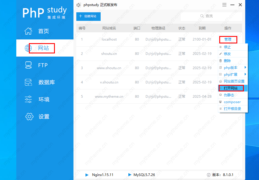 3,然后再回到网站这个页面。【网站--管理--打开网站】开始进入安装苹果cms的步骤。
