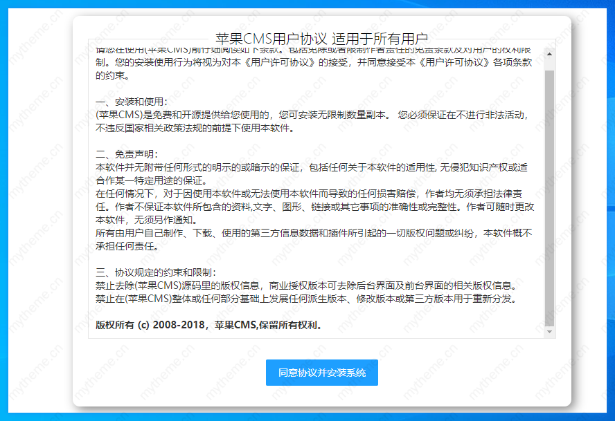 1,打开网站后如果进入苹果cms安装页面就点击同意协议并安装系统,如果没有出现下面页面尝试刷新下页面。