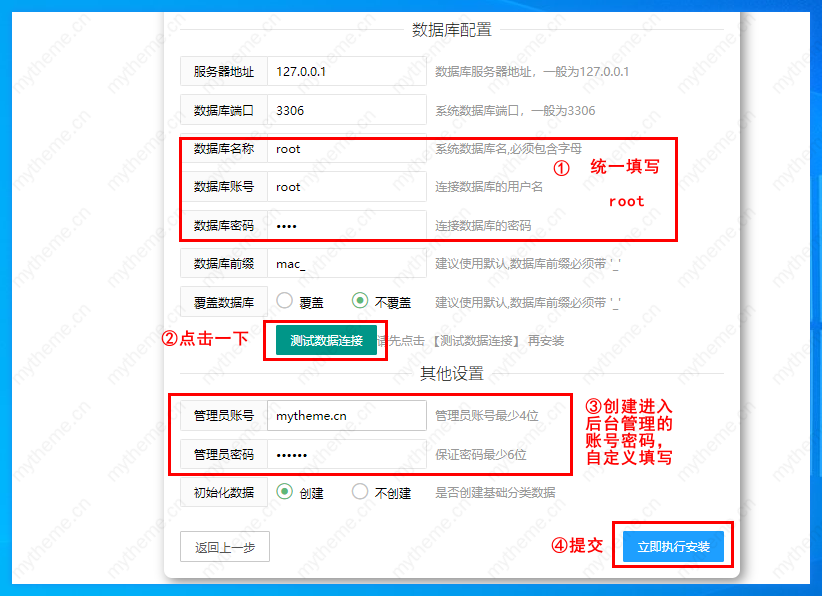 4,数据库配置根据下面截图1-4顺序操作填写即可,