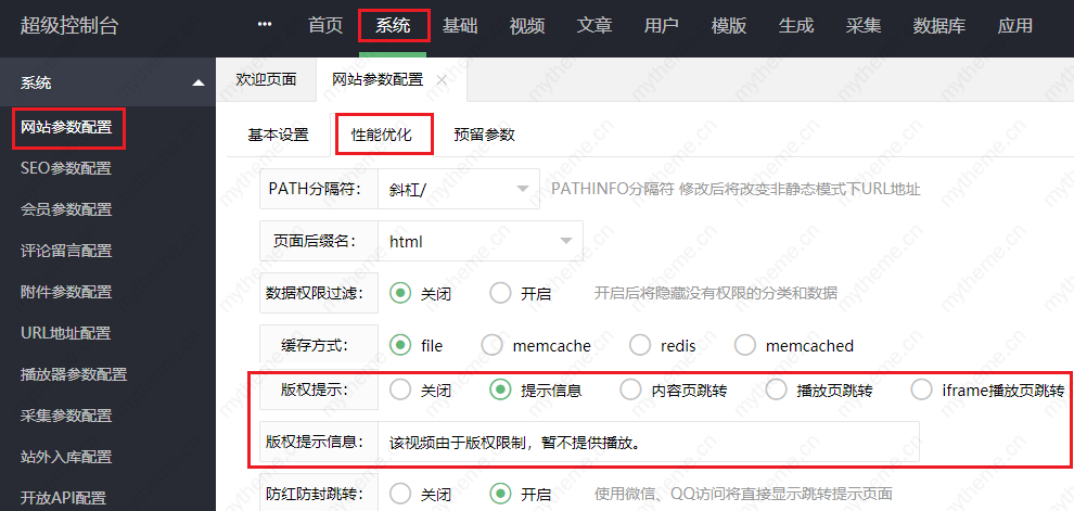 2,首先打开cms后台进入【系统】-【网站参数配置】-【性能优化】版权提示那里选中【提示信息】。【版权提示信息】:可以自定义修改要显示的提示文字。如果选中页面跳转会在打开对应页面时直接跳转至提醒页面,其他选项自行测试,现在只讲一下提示信息的设置。