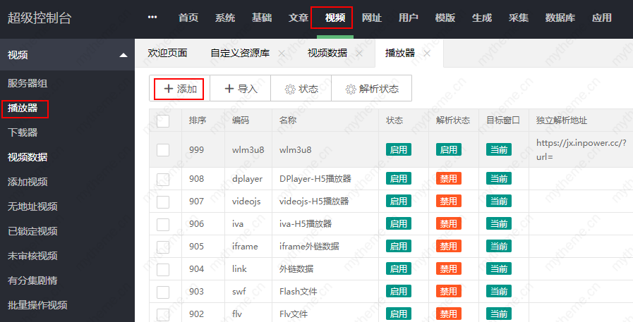 2,有了播放器编码后我们就可以添加新的播放器了,我这里没有其他播放器就用苹果cms自带的DPlayer播放器来举例说明,添加播放器需要确定播放器编码还需要播放器代码。
