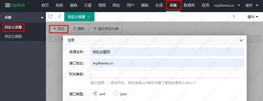 1.进入到苹果cms后台管理,找到选项:采集----自定义资源库----添加--会出现下面的弹窗,这个步骤需要我们找到我们可以采集的网站,然后获取接口地址填写在这里。
