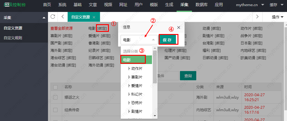 4.进入分类绑定页面后根据下面截图所示的1-4步骤操作即可完成分类的绑定,没有对应分类的可以自己添加分类,添加分类的教程可参考我的主题网之前分享过的帮助文档:苹果cms怎么添加分类 来添加分类即可。