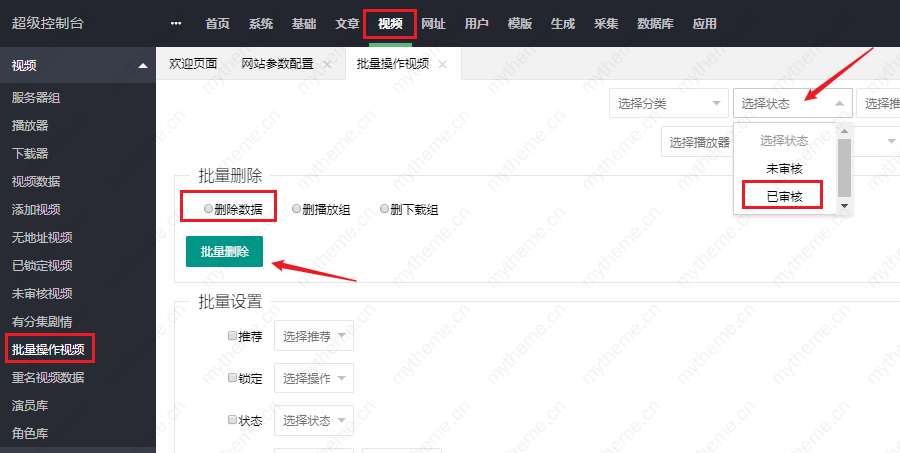 苹果cms系统后台>>视频>>批量操作视频>>选择状态框里选择已审核>>删除数据>>最后点击批量删除(完毕)