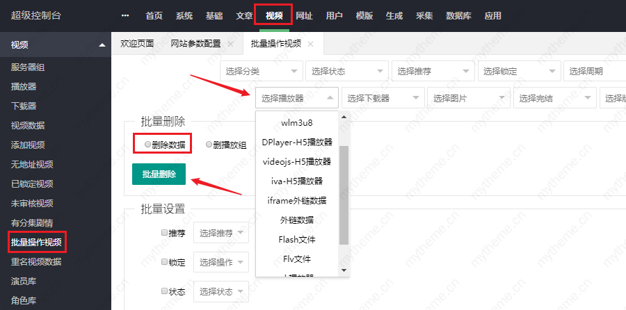 操作步骤:苹果cms系统后台>>视频>>批量操作视频>>选择播放器状态框(选择自己要删除的播放器视频组)>>删除数据>>最后点击批量删除(完毕)