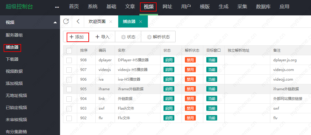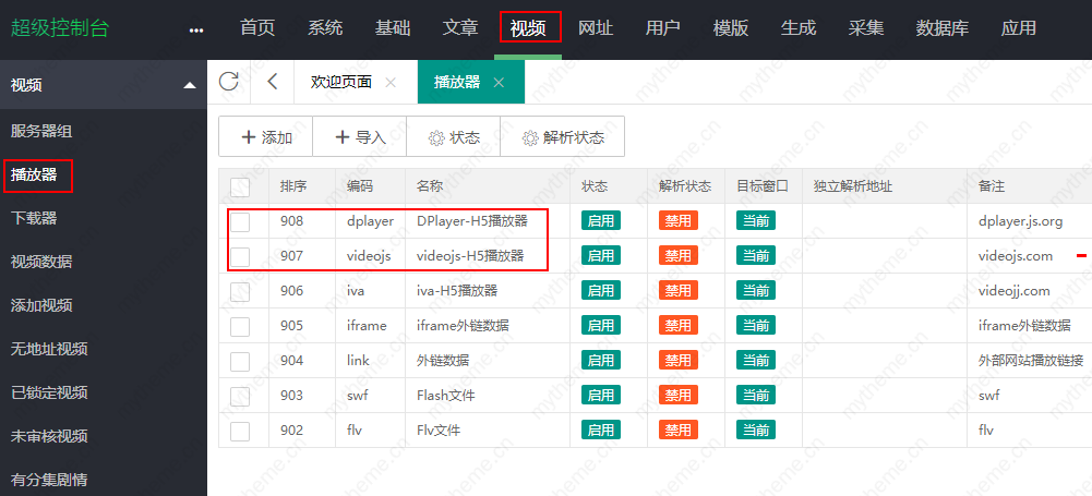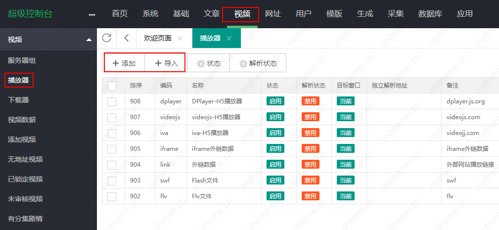 1,采集完资源后添加或是导入m3u8播放器,进入苹果cms后台,找到视频----播放器----添加或是导入,如果你已经准备好了资源站提供的m3u8播放器,直接导入即可。导入播放器比较方便不用修改播放器编码,导入直接使用即可。添加则有点比导入繁琐些,最佳的选择就是采用资源站提供的播放器导入即可。