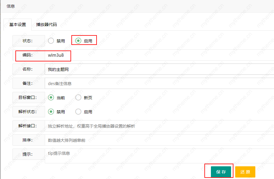6,在基本设置里面最重要的就是编码,比如卧龙资源m3u8的格式编码为wlm3u8,所以我们的播放器编码必须是wlm3u8才可以关联到我们采集的视频,否则不会关联到我们采集的视频.其他选项根据提示填写即可。