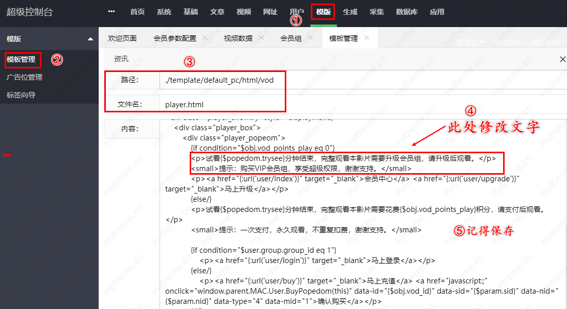 就是登陆苹果cms系统后台管理进行修改。按照下面截图所示的5个操作步骤。我这里是以苹果cms默认自带的模板为例。所以模板路径可能会和你的不一样。你只需找到自己正在使用的苹果cms模板路径进行修改即可。