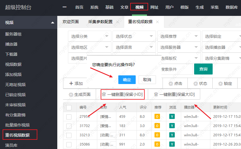 2,对于已经批量采集了重复视频的处理方法:后台“视频”->“重名视频数据”然后选择“一键删重”,保留大ID或者小ID都可以,一键确定删除即可。