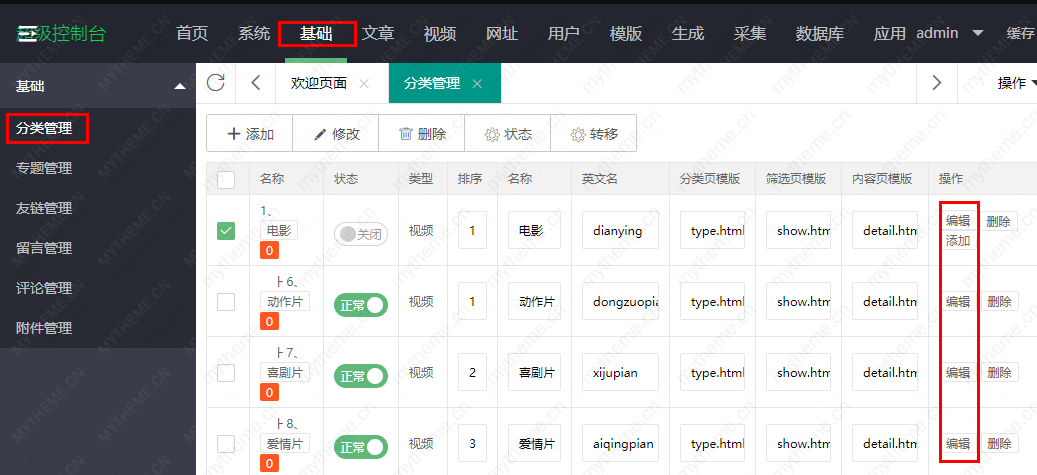 3.进入苹果cms分类的编辑后就是这个样子的,在这里就可以修改我们上面所说的两种场景下所需要的修改。