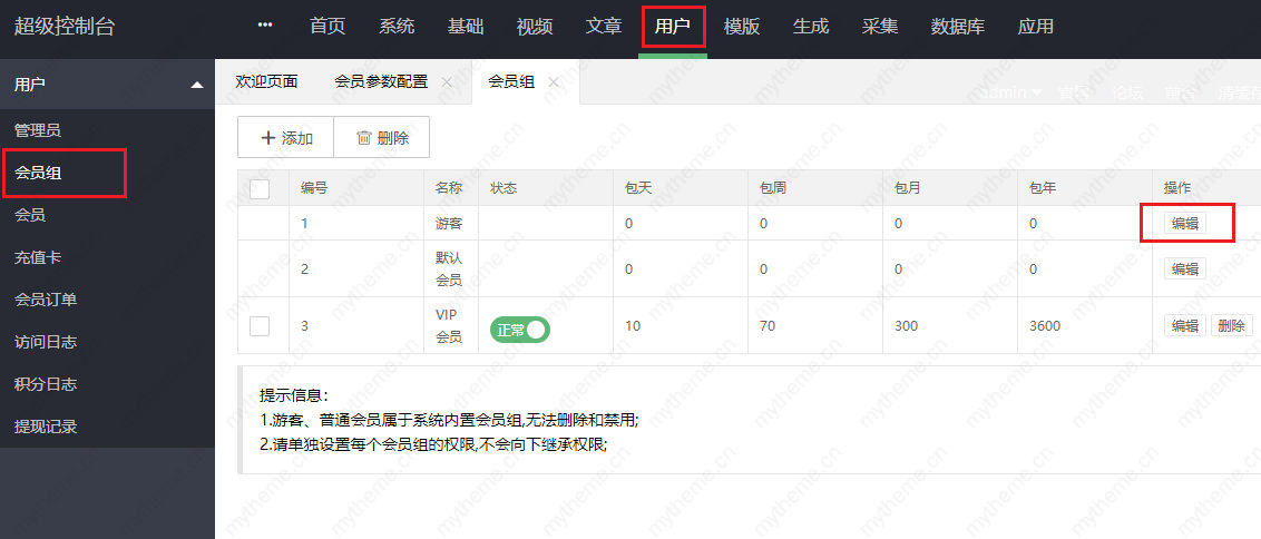 第二步:在后台的 用户-会员组-找到游客用户组-点击编辑按钮
