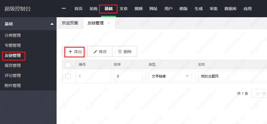 1、进入苹果cms系统后台依次点击 基础>>>友链管理>>>添加 进入添加页面