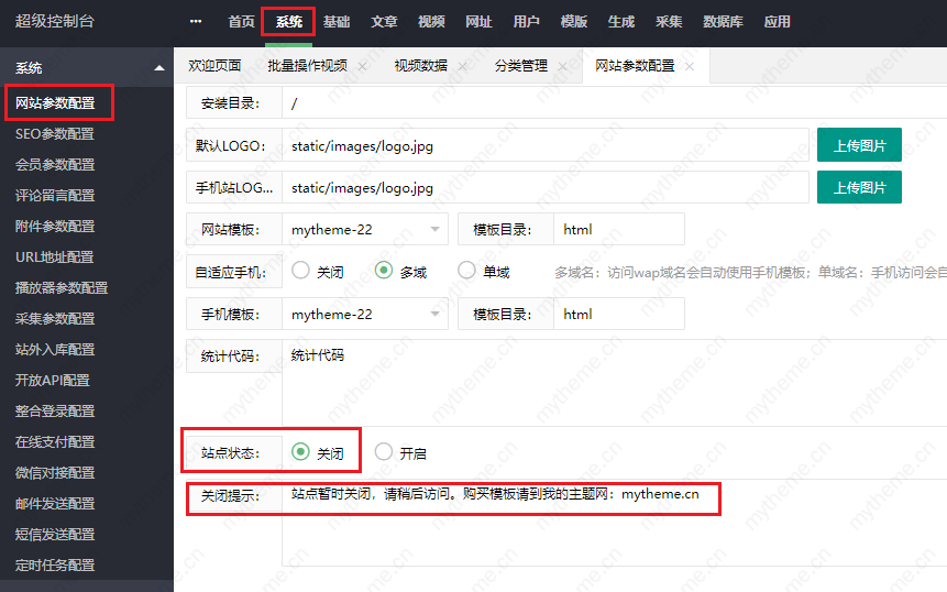 2,操作流程:系统-> 网站参数配置 -> 基本设置 -> 站点状态关闭 ->关闭提示(填写自己想要显示的文字)。