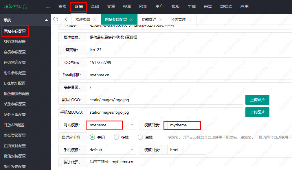 3,无论我们修改了哪一处,我们都需要登录苹果cms后台进行切换修改,如果更改了苹果cms模板的文件名称就重新切换下模板,如果更改了模板的目录名称就更改下你更改后的模板目录名称,我把模板文件名称和模板目录名称都修改成了mytheme所以正确的更改方式就是如下截图所示那样的。