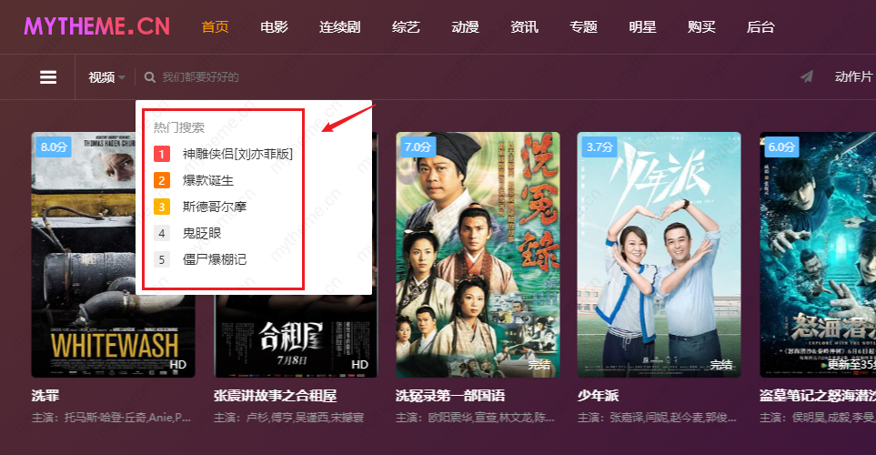1,热门搜索词就是鼠标点击搜索框后自动弹出的热门影片片名,原则是通过访问网站的人根据搜索词的次数多少排序产生的。
