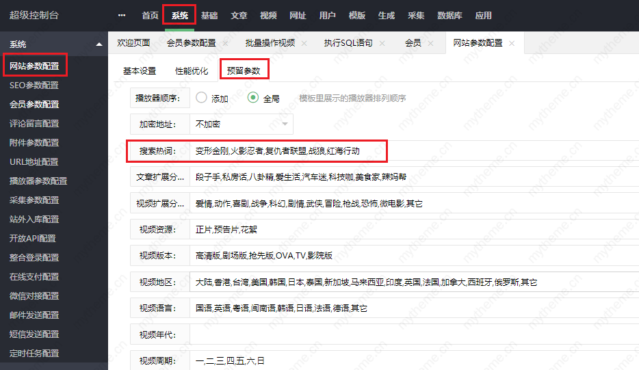 具体操作流程:系统-> 网站参数配置 -> 预留参数 ->搜索热词(用英文逗号分隔)