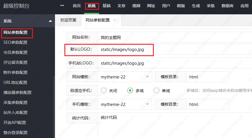 1,这个操作方式是针对苹果cms默认自带的模板设置流程。来到苹果cms的管理后台在默认LOGO处填写logo链接或是上传自己的logo图片:系统 -> 网站参数配置 -> 基本设置 -> 默认LOGO