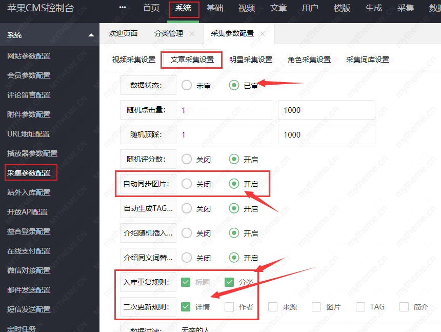 进入到苹果cms系统后台管理导航上面的系统→采集参数配置→切换到文章采集设置,首先开启数据状态为已审、开启自动同步图片、入库重复规则勾选分类和标题,二次更新规则勾选详情即可,其他不用勾选默认保存即可完成了苹果cms文章资讯采集接口配置。