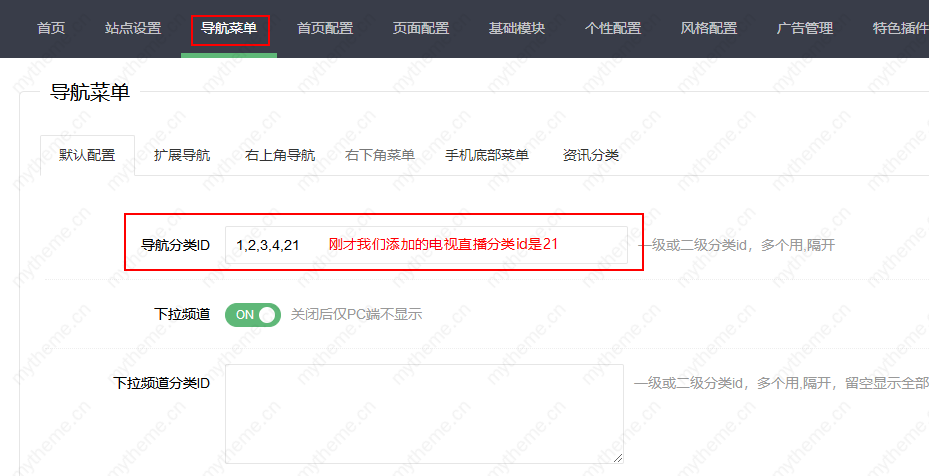 4,如果需要在首页导航显示我们的“电视直播”分类的话,我们需要来到模板后台填写我们新添加的分类id。注意:是模板后台不是苹果系统后台。