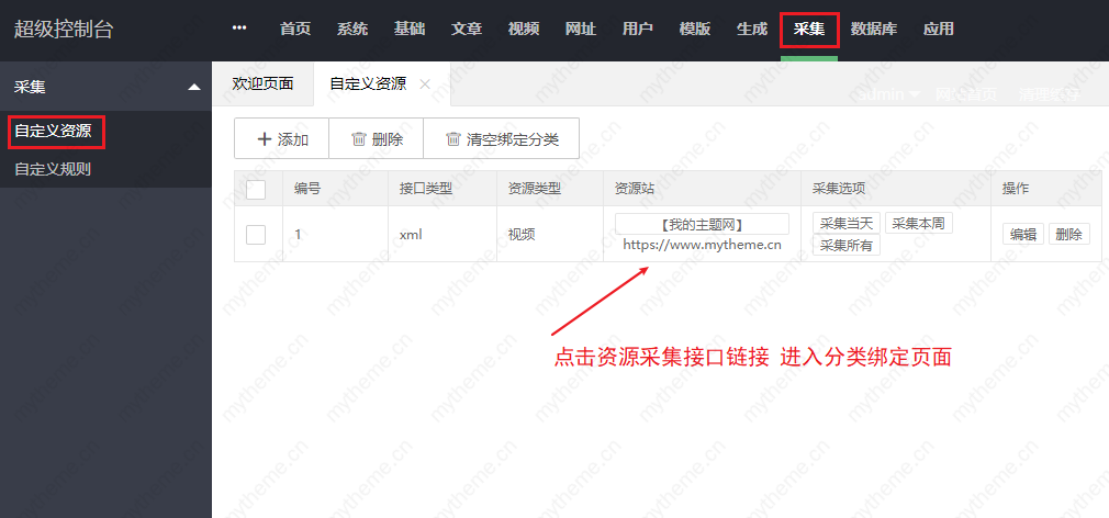1,来到系统后台--采集--自定义资源库--鼠标点击你添加好的采集接口链接 进入分类的绑定页面去绑定分类。很多新手添加采集接口后直接去点击采集,忽略了分类的绑定步骤。