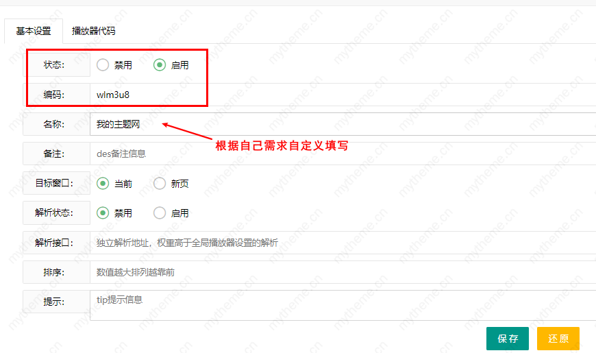 3,首先填写基本设置,比如我们的资源播放器编码是“wlm3u8”我们就在编码选项框里直接填写即可。我们把最重要的信息填写后,下面根据自己需求填写即可。