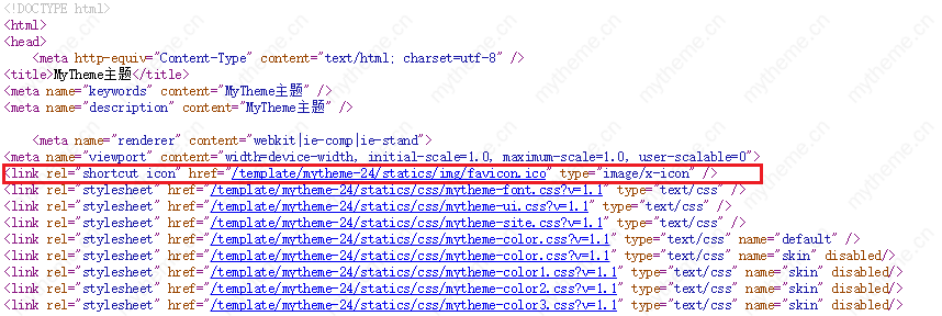 操作步骤:打开你的网站首页>>鼠标右键>>查看网页源代码>>找出有“favicon”字样的一行代码(如下图)中的/template/mytheme-24/statics/img/favicon.ico