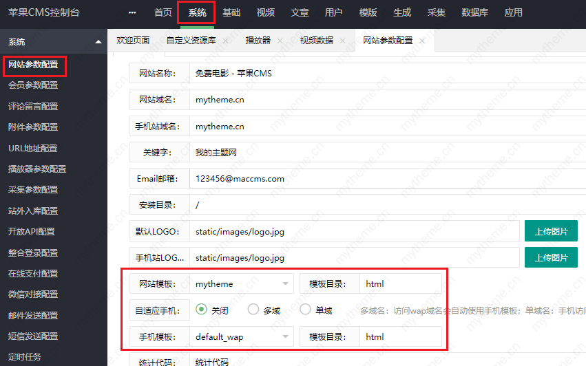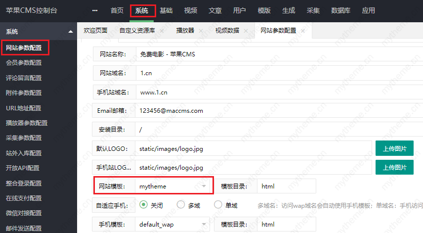 1-4:登陆网站后台,点击“系统”-“网站参数配置”-“网站模板”可以切换我们上传的模板。