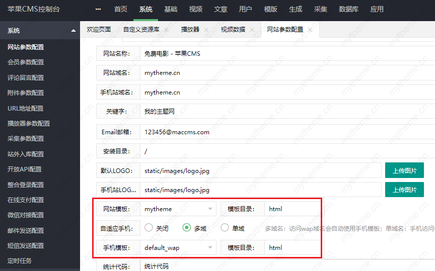 2-1:找到【网站模板】,选择新上传的这个模板目录名称。例:苹果cms默认pc模板目录名称是 “default_pc”