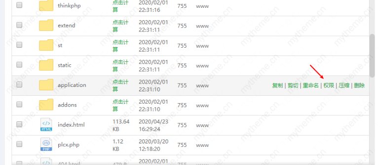 1,来到网站根目录,找到application目录然后找到权限按钮,进行点击。(宝塔面板为例)