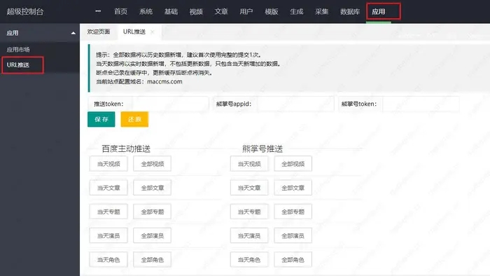 为了提高网站seo优化,网站搭建正常运转后我们需要对网站的视频,资讯,文章等内容数据能够及时的提交给百度搜索,缩短蜘蛛爬取收录时间加快收录。我们需要对苹果cms系统自带的百度主动URL推送进行设置使用。