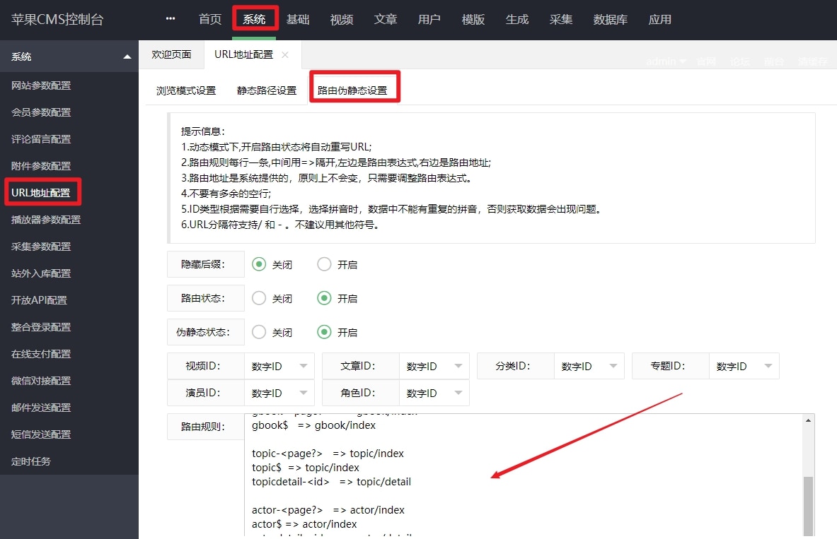 2,规则上传完后进行下一步操作在苹果cms后台,系统—>URL地址设置—>路由伪静态设置中开启对应功能按钮即可大功告成。