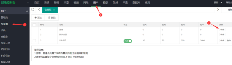 1、其实这个问题是因为新增的分类还没有设置用户组权限造成的。如下图步骤,依次进入【用户】——【会员组】页面,即可看到系统默认的三个会员组:游客、默认会员和vip会员,我们点击游客右侧的“编辑”按钮,进入游客权限编辑页面。