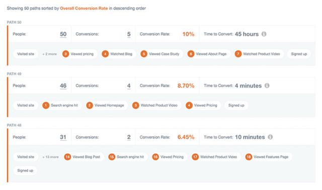 路径报告可显示访问者的转化路径,用户访问频道的方式(搜索引擎查询,直接键入网址等),用户采取的操作,以及每个路径的转化率以及转化所花费的时间。这些数据让开发人员更容易修正路径,并可能为企业带来直接收益。
