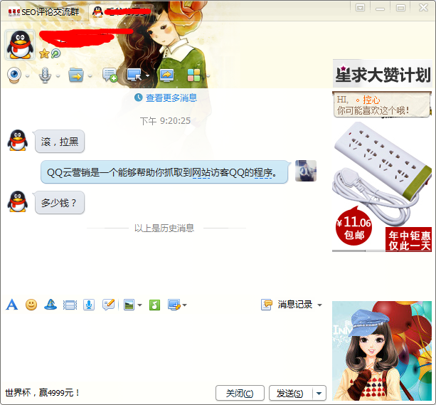 你的先天优势是什么?我的先天优势就是能够把访问我网站的用户QQ全部抓取到,当然,不是每一个我都会加QQ的,相信加了部分人的QQ,部分人已经察觉到了,这就是我们的先天优势,对于这一点我并不是用来推广,利用自己的先天优势抓住精准客户营销是非常重要的。当然,你的先天优势可以是QQ好友比较多,也可以是粉丝比较多,看起来不起眼的粉丝,合理的利用可能效果不一般。