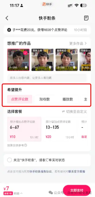 白杨SEO再简单说一下,比如搜索点击,评论互动,点赞,分享这些都是可以来操作的,一种是用技术,一种是直接投放快手粉条也可以做这些数据,如图。