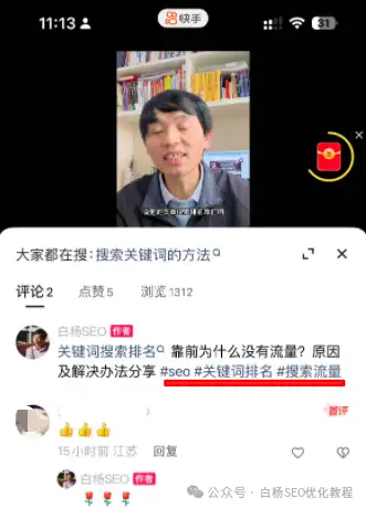 短视频说明描述优化,这里是指你要总结你短视频主要内容,这样方便快手尽快抓取主要内容。如果你的说明描述优化里也包含了关键词的长尾关键词,比如“白杨SEO博客这个SEO学习网站”,那么也会有助于排名哈。