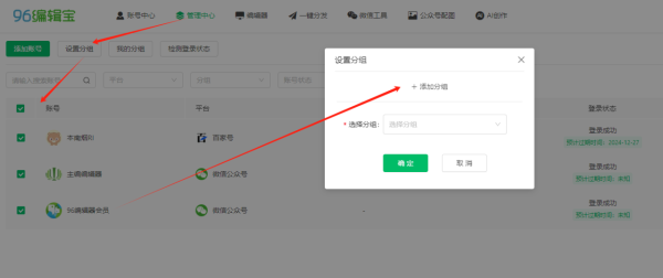 添加完账号之后,如果我们需要对账号进行统一管理,比如账号分组、删除、置顶等,都可以在编辑宝的管理中心进行操作▼