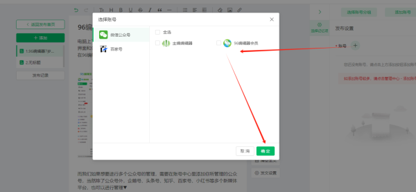 这些都做好之后,我们点击右侧的添加账号,选择好需要分发文章的平台和账号,然后点击确定,就可以了▼