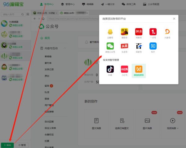 下载96编辑宝登录之后,首先要添加账号。点击左下角的“添加”,选择相应的平台登录即可▼
