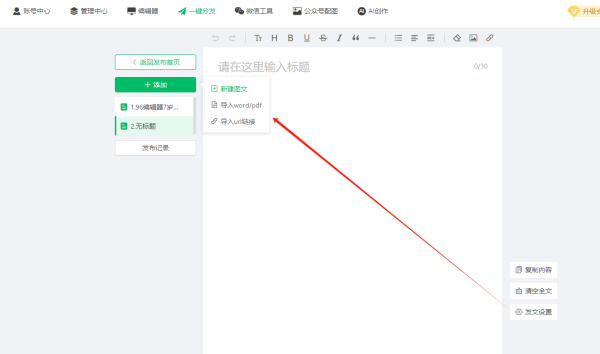 一键分发页面中,可以通过发文设置来添加多篇文章、导入Word或者PPT,以及导入链接都可以▼