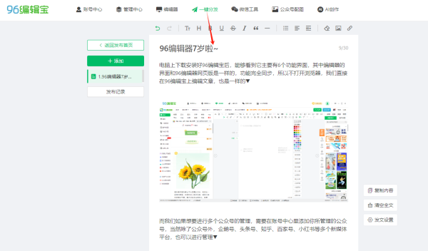 添加完账号,我们如果想要把自己的文章一键发布到多个平台中,可以到编辑宝的“一键分发”页面进行操作。