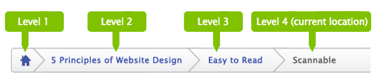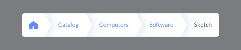 在设计的时候应当仔细考虑尺寸和间隔大小,不同的面包屑层级之间应当有足够的间距,确保用户能够识别。当然你也不希望面包屑占据页面太多的空间,如果面包屑比顶部导航还要大,看起来就非常尴尬了。